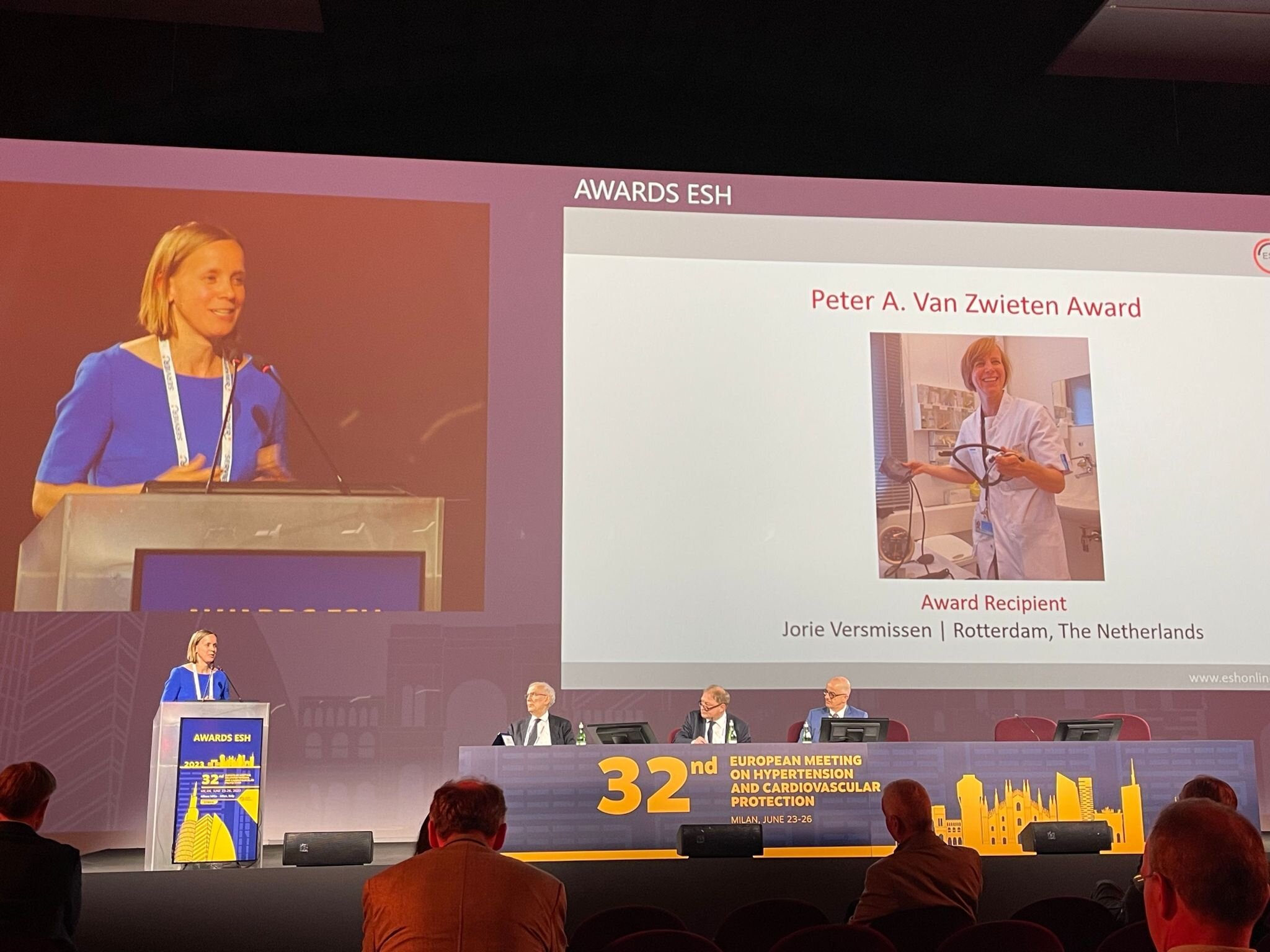 Tijdens het ESH-congres in Milaan ontving de Rotterdamse internist-klinisch farmacoloog dr. Jorie Versmissen de prestigieuze Pieter A. van Zwieten Award voor haar uitzonderlijke bijdragen aan hypertensie-onderzoek