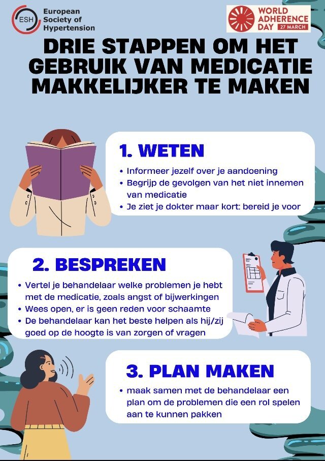 Gezien het belang en de omvang van het probleem, is vandaag 27 maart de allereerste World Adherence Day! Een dag voor extra awareness, om het belang nog eens extra onder de aandacht te brengen. Met de ESH European Society of Hypertension is onderstaand hulpmiddel opgesteld voor patiënten voor open en respectvolle communicatie. Happy World Adherence Day!